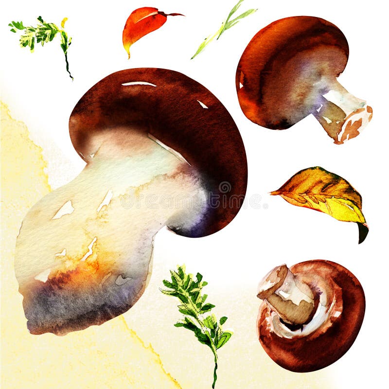 Hongo aislado sobre fondo blanco. Champiñones, setas porcini. Pintura a la acuarela sobre fondo blanco