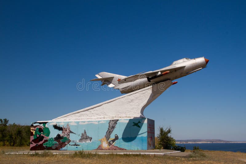 Aeroplano. Monumento al avión de la Segunda Guerra Mundial en el lado del río