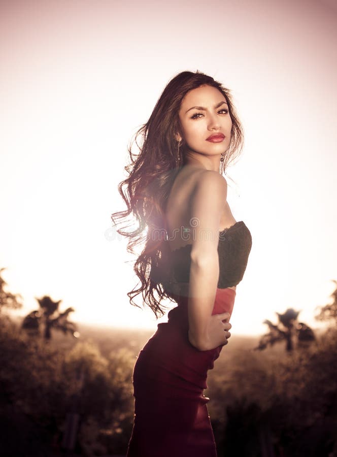 Joven mujer hermosa y elegante. Hermosa y elegante joven mujer de pie, imponente sobre una puesta de sol tropical.