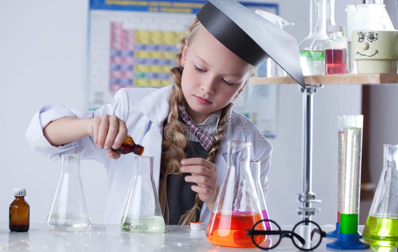 Adorable niña pequeña realizando un experimento. Niña pequeña inteligente y adorable realizando un experimento en el laboratorio